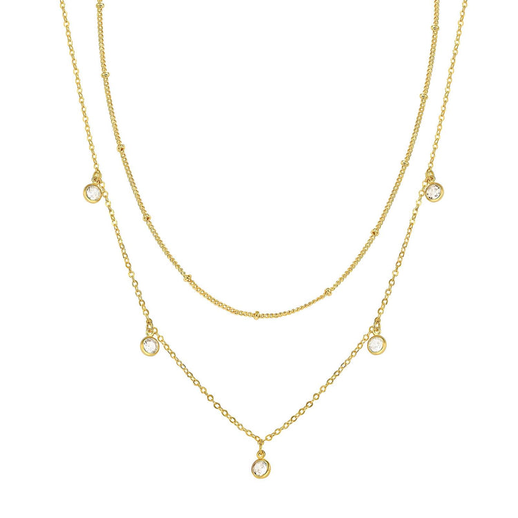 Effortlessly elegant, this double-layer gold necklace features delicate chains adorned with shimmering bezel-set charms. The layered design adds depth and movement, making it a perfect choice for both everyday sparkle and refined occasions. Wear it solo or pair it with other pieces for a chic, stacked look.